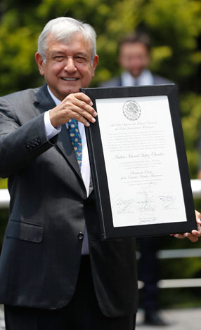 ▲ Andrés Manuel López Obrador muestra a los medios la constancia de presidente electo tras recibirla de los magistrados del Tribunal Electoral del Poder Judicial de la Federación. Foto Carlos Ramos Mamahua