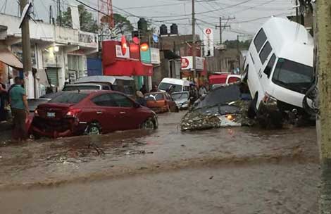 ▲ El fenómeno azotó la tarde de ayer varias delegaciones de Ciudad de México y cinco municipios del oriente mexiquense. Se reportó la suspensión momentánea de operaciones en el aeropuerto internacional, así como inundaciones en vialidades primarias e instalaciones del Metro, congestión vehicular por varias horas y caída de árboles. En Chimalhuacán (imagen) se formaron corrientes que causaron el deceso de dos personas y arrastraron una decena de vehículos. Foto tomada de Twitter