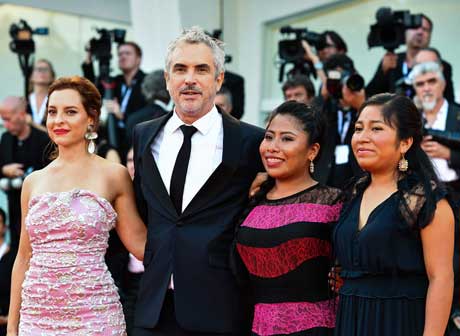 El director mexicano, acompañado de las actrices Marina de Tavira (a su izquierda), Yalitza Aparicio y Nancy García, presentó ayer la cinta, la cual es fuerte aspirante al León de Oro. El filme, ambientado en los años 70, está dedicado a Lobi, una mujer indígena que cuidó al realizador cuando era pequeño, tras el abandono de su padre. Foto Afp