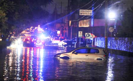 ▲ La intensa lluvia que cayó la tarde y la noche de ayer en las delegaciones Tlalpan, Coyoacán, Xochimilco, Cuajimalpa e Iztapalapa generó que al menos una veintena de vehículos quedaran atrapados y que varias personas fueran rescatadas con lanchas en sitios inundados; en algunos puntos el agua alcanzó un metro de altura. Una de las zonas críticas fue el cruce de Periférico y Zacatépetl (imagen), a un costado de Perisur. Foto Víctor Camacho.