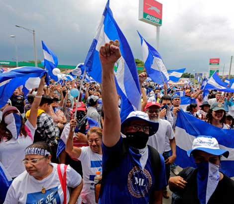 ▲ Miles de personas participaron ayer en la llamada Marcha de los globos por las calles de Managua y otras ciudades para demandar la excarcelación de manifestantes detenidos en las protestas contra el gobierno de Daniel Ortega. En las movilizaciones hubo asedio de grupos presuntamente oficialistas, los cuales han sido acusados por jerarcas católicos de atacar varias iglesias. Foto Afp