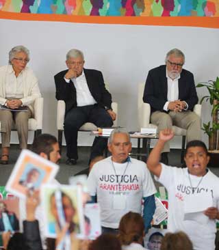 No tengo compromiso alguno con grupos de intereses creados, con ninguna mafia... vamos a que se termine con esta pesadilla, con este dolor, dijo el presidente electo, Andrés Manuel López Obrador, ante cientos de familias de víctimas que durante tres horas le narraron sus historias. Lo acompañan Olga Sánchez Cordero y Alejandro Encinas, quienes serán los encargados de atender el problema. Foto José Antonio López