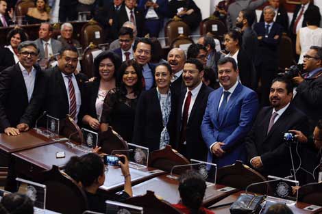 ▲ Con la presencia, entre otros, de Claudia Sheinbaum, jefa de Gobierno electa; de José Ramón Amieva, actual titular del Ejecutivo local, y de Martí Batres y Mario Delgado, presidentes del Senado y de la Cámara de Diputados, respectivamente, los 66 legisladores capitalinos rindieron protesta ayer, con Morena como primera fuerza. El petista Jesús Martín del Campo presidirá la mesa directiva. En la sesión se declaró que entra en vigor la Constitución Política de la capital. Foto Cristina Rodríguez.