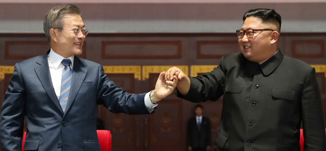 ▲ El presidente de Corea del Sur, Moon Jae-in, y el líder norcoreano, Kim Jong-un, anunciaron ayer pactos que incluyen la promesa del país socialista de desmantelar su principal complejo nuclear, permitir que se verifique el cierre de un sitio de lanzamiento de misiles y trabajar juntos para realizar los Juegos Olímpicos de 2032. EU, Rusia y la UE elogiaron los convenios. Foto Ap