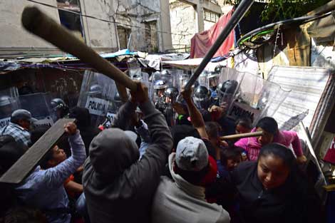 ▲ Integrantes de un centenar de familias que ocupaban de manera irregular un predio ubicado en la calle Roma 18, en la colonia Juárez, delegación Cuauhtémoc, se enfrentaron al agrupamiento de granaderos para evitar su expulsión. Los moradores, la mayoría otomíes, aseguraron que vivían en el inmueble desde hace más de 20 años. La gresca comenzó cuando ya no se les permitió ingresar a la construcción para recuperar sus bienes y entonces empezaron a lanzar piedras, palos y bombas molotov. Foto Afp