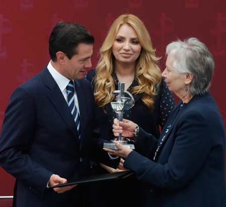 ▲ El galardón, recién creado para distinguir a personajes con una trayectoria sobresaliente en el cine mexicano, fue entregado por el presidente Enrique Peña Nieto en una ceremonia en el Castillo de Chapultepec. Su esposa, Angélica Rivera, promotora del reconocimiento, atestigua el acto. Foto Carlos Ramos Mamahua.