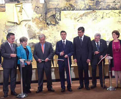 ▲ El mandatario Enrique Peña Nieto cortó el listón inaugural de la pintura Agenda 2030. Entre los participantes estuvieron el secretario general del organismo multilateral, António Guterres, y el pintor zacatecano. El título del cuadro se refiere a los Objetivos de Desarrollo Sostenible que, entre sus metas, tiene eliminar la pobreza extrema. Foto Presidencia