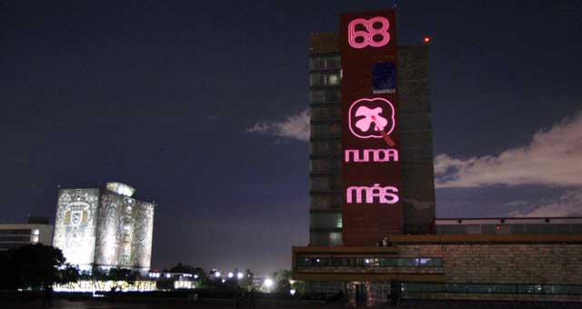 ▲ En señal de luto por los sucesos de 1968, la Universidad Nacional Autónoma de México montó anoche sobre la fachada poniente de la Torre de Rectoría, una imagen lumínica con la leyenda: 68 Nunca Más, en la que aparece la figura de la paloma de la paz (símbolo de los Juegos Olímpicos de ese año) con el corazón cruzado por la punta de una bayoneta ensangrentada. Este martes, sobre la misma pared, será colocada una manta negra y en la noche se proyectará otra vez el mensaje. Foto Cristina Rodríguez