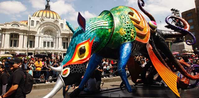 ▲ Alrededor de 180 figuras fantasmagóricas desfilaron este sábado por el centro Histórico provenientes de siete estados, en lo que fue la decimosegunda edición de la parada que organiza cada año el Museo de Arte Popular. Los alebrijes realizados por artesanos mexicanos permanecerán expuestos hasta el 4 de noviembre en reforma. Foto roberto García Ortiz