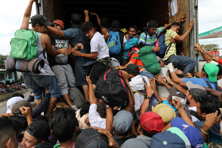 ▲ La primera caravana, integrada por 5 mil centroamericanos, se dividió este sábado, luego de que el gobernador de Veracruz les ofreció 150 autobuses para llegar a la capital del país y después se retractó. En la madrugada, un grupo partió de Sayula hacia Ciudad Isla (imagen) en aventón o como pudo, otro avanzó a Puebla y algunos decidieron continuar el camino hasta Ciudad de México. Los contingentes iban acompañados por representantes de Derechos Humanos de Oaxaca y de CDMX, así como la Cruz Roja. Foto Ap