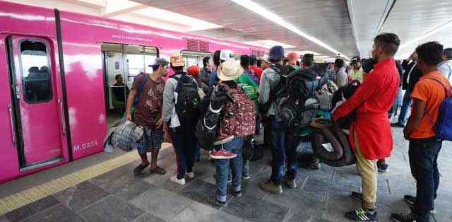 ▲ Parte de los cientos de migrantes de Centroamérica que llegaron ayer a la capital del país fueron trasladados en el Metro hacia al albergue instalado en la Magdalena Mixhuca, el cual se vio ayer rebasado en su capacidad. Muchos venían en familia, visiblemente cansados, cargando mochilas, cobijas y bolsas con comida que les regalaron en el camino. Foto Alfredo Domínguez