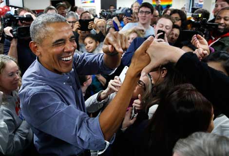▲ El ex presidente Barack Obama ha tenido una participación activa en apoyo a las campañas de candidatos demócratas para las elecciones intermedias que se realizan hoy en Estados Unidos; ayer estuvo en una localidad de Virginia. En los comicios están en disputa todos los escaños de la Cámara de Representantes, un tercio del Senado y 36 gubernaturas. Foto Ap