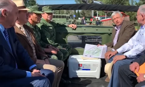 ▲ El presidente electo, con el plan maestro en mano para construir dos pistas en Santa Lucía, recorrió la zona acompañado, entre otros, de los próximos titulares de Sedena, Marina y la SCT. Foto tomada de video