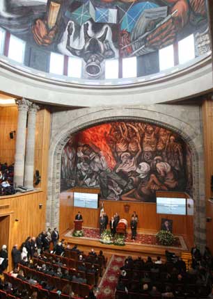 ▲ Con los murales de José Clemente Orozco como fondo, el escritor fue recordado ayer de cuerpo presente en el Paraninfo de la Universidad de Guadalajara; horas después fue cremado. Sus cenizas serán trasladadas hoy a su natal Ciudad de México para un homenaje en el Palacio de Bellas Artes. Sergio Ramírez, premio Cervantes al igual que el autor de Noticias del Imperio, dijo que su muerte es