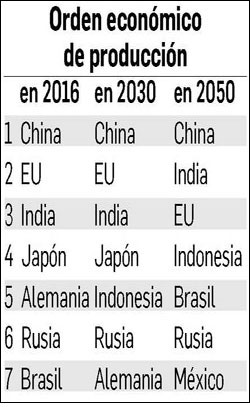 Aquí, unos datos importantes del tamaño de las economías en los próximos años, de los países con mayor producción interna bruta en fechas clave; la tabla es resultado de un estudio de Pricewaterhouse Coopers, en la que muestra de qué tamaño de economía será cada nación, y por tanto, qué tanto pueden aportar nuestras exportaciones.