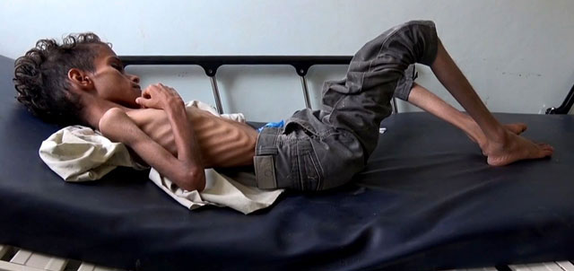 ▲ Ghazi Saleh, de 10 años, pesa ocho kilogramos y apenas puede respirar al ser atendido de severa desnutrición en el hospital Al Moudhafar, ubicado en Taez. En el país de la península arábiga más de 14 millones de personas están al borde de la hambruna y la mitad son niños, según datos del Unicef. Cerca de 85 mil menores habrían muerto entre abril de 2015 y octubre de 2018. Foto Afp