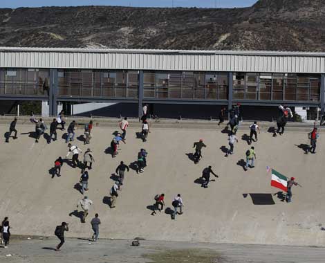 ▲ De forma caótica, decenas de migrantes, la mayoría hondureños, intentaron entrar a la garita fronteriza estadunidense en Tijuana, Baja California, tras rebasar por los costados una valla de la Policía Federal. Varios, en su intempestiva carrera, se hallaron en callejones sin salida y fueron detenidos. La marcha fue planeada hace varios días y se había acordado que fuera pacífica. Foto Víctor Camacho