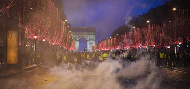 ▲ Las protestas de los chalecos amarillos, movimiento ciudadano contra el encarecimiento de los combustibles y las reformas económicas del presidente Emmanuel Macron derivaron por cuarta semana consecutiva en enfrentamientos con agentes antimotines en París (imagen) y otras ciudades de Francia, con saldo de más de mil arrestos y 118 heridos. Según cifras oficiales, se manifestaron alrededor de 125 mil personas en todo el país. La Torre Eiffel, el museo del Louvre y otros sitios emblemáticos fueron cerrados. El primer ministro Edouard Philippe dijo que el mandatario hablará y propondrá medidas para nutrir el diálogo. Foto Afp