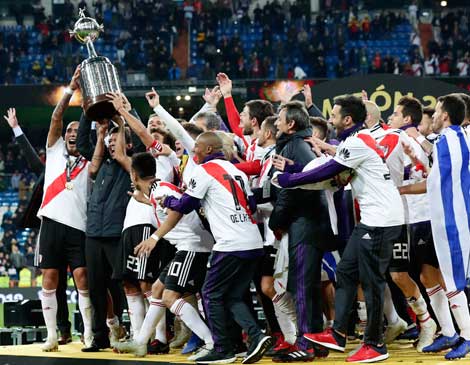 ▲ Los Millonarios se coronaron al vencer 3-1 en tiempo extra a Boca Juniors, que se quedó con nueve hombres en el tramo fi nal del partido en el estadio Santiago Bernabéu, en Madrid. Darío Benedetto dio esperanzas a los xeneizes al abrir el marcador a los 44 minutos, pero Lucas Pratto (68), Juan Quintero (109) y Gonzalo Martínez (120+1) dieron el triunfo a River Plate. Foto Ap