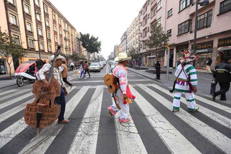 ▲ Luis, Candelario y Daniel, wixárikas de Nayar, Nayarit, están en la capital del país desde el primero de diciembre, cuando acudieron a la toma de posesión de Andrés Manuel López Obrador, en espera de que los reciba para darle a conocer las necesidades de su municipio y los ayude a solventarlas. En tanto, recorren la ciudad tocando sus instrumentos para obtener recursos y financiar su estancia. Foto Luis Castillo