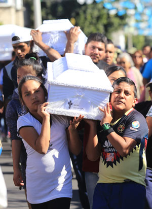 ▲ Una fogata que se salió de control fue la causa del incendio en que siete menores perecieron el viernes pasado en su domicilio en la colonia Buenavista, en Iztapalapa, informó la Procuraduría General de Justicia de Ciudad de México. Tras ser velados, los siete féretros blancos fueron llevados en procesión (en la imagen), a la iglesia del pueblo de Santa Cruz Meyehualco, entre música, flores y cohetones, acompañados por cientos de personas que abarrotaron las calles y fueron escoltadas por patrullas. Foto Luis Castillo