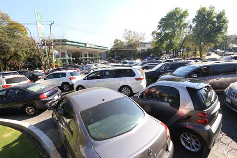 ▲ Congestión vial en los alrededores de una gasolinería de avenida Virreyes tras los rumores de desabasto en Ciudad de México. Autoridades informaron que ayer 17 estaciones, ubicadas en ocho alcaldías, cerraron u operaron a medias ante la falta de combustible. La Secretaría de Energía informó de 19 casos en el estado de México. Foto La Jornada / Luis Castillo