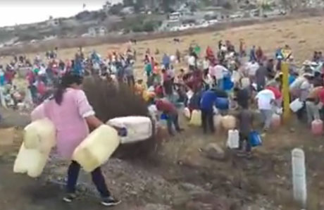 ▲ Habitantes de San Antonio Detiña (imagen), municipio de Acambay, estado de México, aprovecharon la fuga de gasolina en un ducto de Pemex para abastecerse del combustible en todo tipo de contenedores. En el video grabado por un testigo se ve a lo lejos un helicóptero que sobrevuela la zona. Autoridades mexiquenses informaron de otras dos fugas, una en Palo Quemado, municipio de San Francisco, y otra en los límites con Hidalgo. Foto tomada del Facebook de Pancho Sandoval