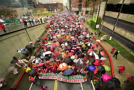 ▲ Los profesores realizaron marchas y plantones en cientos de escuelas californianas en demanda de que se eliminen los recortes al gasto, que sea menos abultado el número de alumnos por clase y que se ponga un alto a las reformas privatizadoras. El paro se suma a una ola de acciones reivindicadoras de la enseñanza pública en al menos seis estados. Foto Afp