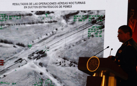 ▲ El general Luis Sandoval González, titular de la Sedena, detalla la acción aérea y terrestre que evitó que el ducto Tuxpan-Azcapotzalco fuera perforado en la madrugada de ayer jueves por huachicoleros. En la conferencia, el presidente Andrés Manuel López Obrador dijo que aumentará la cifra de soldados en la vigilancia de la red de suministro. Foto Roberto García Ortiz