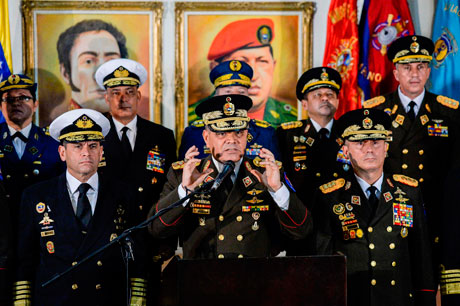 ▲ El ministro de Defensa de Venezuela, general Vladimir Padrino López, encabezó una conferencia de prensa en Caracas, flanqueado por el Alto Mando Militar de la Fuerza Armada, en respaldo al presidente Nicolás Maduro.