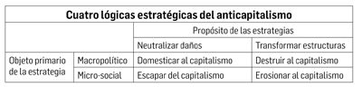 A principios de los años 80, Margaret Thatcher hizo famosa la frase: “No hay alternativa”, pero dos décadas después el Foro Social Mundial declaró que “Otro mundo es posible”. Yo argumento que otro mundo –uno con mejores condiciones para el florecimiento humano de la mayoría– es, en verdad, posible. Elementos de este nuevo mundo están siendo ya creados hoy. El anticapitalismo es posible, no sólo como postura moral frente a los daños e injusticias del capitalismo global, sino como posición práctica hacia la construcción de una alternativa de mayor florecimiento humano. Históricamente, el anticapitalismo ha sido animado por cuatro diferentes lógicas de resistencia: destruir el capitalismo; domesticarlo; escapar de él, y erosionarlo. Estas cuatro formas de capitalismo pueden verse variando en dos dimensiones: el propósito de las estrategias anticapitalistas: trascender el capitalismo o neutralizar sus peores daños; la otra dimensión se refiere al objeto al que se dirigen las estrategias: el macro-nivel del sistema o las actividades de individuos, organizaciones y comunidades al micronivel. Con lo precedente se construye la siguiente tipología: (en el cuadro)