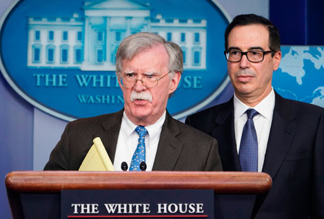 ▲ John Bolton, titular de Seguridad Nacional estadunidense, acompañado de Steven Mnuchin, secretario del Tesoro, anuncia en Washington las nuevas y drásticas sanciones contra el gobierno de Nicolás Maduro. Las medidas buscan respaldar al líder opositor Juan Guaidó, a quien la Casa Blanca reconoció como presidente legítimo de Venezuela. Foto Afp