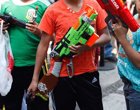 Autoridades capitalinas instalaron ayer un módulo de recepción y canje de armas de fuego en el atrio de la iglesia del Santo Sepulcro, en esa alcaldía. Rosa Icela Rodríguez, secretaria de Gobierno, informó que, en el caso de Gustavo A. Madero, se recibieron 400 artefactos en 10 días. Algunos niños llevaron juguetes bélicos para intercambiarlos por otros artículos. Foto Cristina Rodríguez