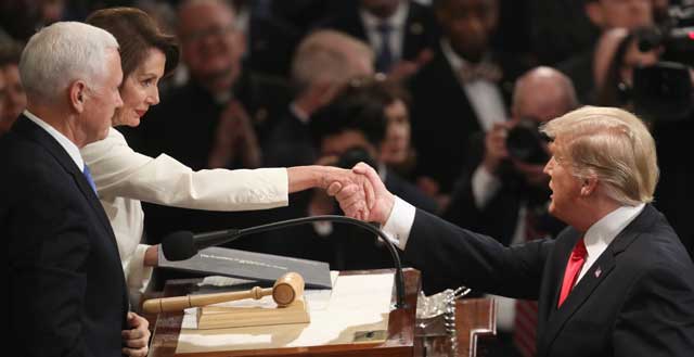 La legisladora demócrata Nancy Pelosi, quien encabeza la Cámara de Representantes, saluda al mandatario durante su segundo informe anual a la nación. El jefe de la Casa Blanca insistió en que la crisis en la frontera con México sólo puede ser enfrentada con un muro y justificó su intervención en Venezuela como un gran rescate de la democracia. Foto Afp
