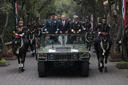 ▲ El presidente Andrés Manuel López Obrador encabezó ayer la ceremonia por el 106 aniversario de la Marcha de la Lealtad. Acompañado por los titulares de la Sedena, Luis Cresencio Sandoval, y de Marina, José Rafael Ojeda, recordó que el 9 de febrero de 1913 se inició el levantamiento armado contra Francisco I. Madero, a quien calificó de hombre bueno, patriota y demócrata. Durante el acto, el mando castrense agradeció la confianza que se les otorga