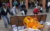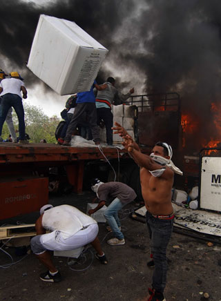 ▲ Jóvenes opositores al gobierno chavista queman en la frontera de Cúcuta cajas con la