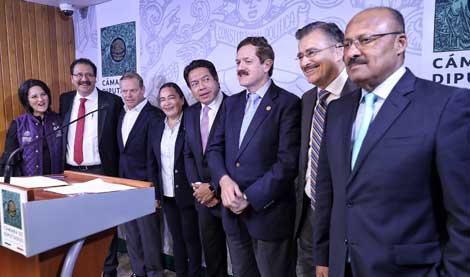 ▲ Los coordinadores de todas las fracciones en la Cámara de Diputados ofrecieron una conferencia de prensa tras la votación de 463 legisladores en favor de la minuta que crea la Guardia Nacional y sólo uno en contra. De izquierda a derecha: Olga Elizondo, Reginaldo Sandoval, Arturo Escobar, Verónica Juárez, Mario Delgado, Juan Carlos Romero Hicks, Tonatiuh Bravo y René Juárez. Foto Marco Peláez