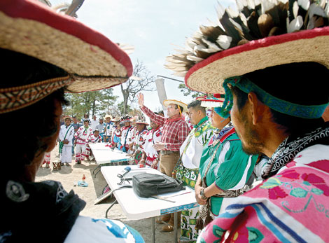 Después de 51 años de lucha para recuperar parte de su territorio, la comunidad wixárica de Bancos de San Hipólito, municipio de Mezquital, Durango, acreditó la acción de reconocimiento y titulación de bienes comunales sobre 10 mil 720 hectáreas. Este viernes, un rito de agradecimiento a las deidades wixaritari dio inicio a los festejos por la sentencia definitiva del Tribunal Agrario 7. Foto Arturo Campos Cedillo