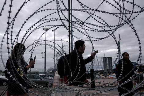 ▲ Un hombre muestra su visa al momento de trasladarse de Tijuana a la garita de San Ysidro, rumbo a San Diego. Las restricciones del gobierno estadunidense, además de un reacomodo de agentes aduaneros, han provocado que los cruces se vuelvan tortuosos. Hoy se espera la visita del presidente Donald Trump a Calexico, California, para revisar la reconstrucción del muro fronterizo. Foto Afp