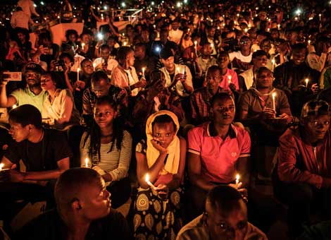 ▲ Miles de ruandeses comenzaron ayer una semana de oraciones en recuerdo del asesinato de 800 mil tutsis y hutus moderados, entre abril y julio de 1994, instigado por el régimen extremista hutu. El presidente Paul Kagame, quien encabezó en aquel entonces la entrada del Frente Patriótico Ruandés a Kigali para frenar la masacre, elogió a su pueblo