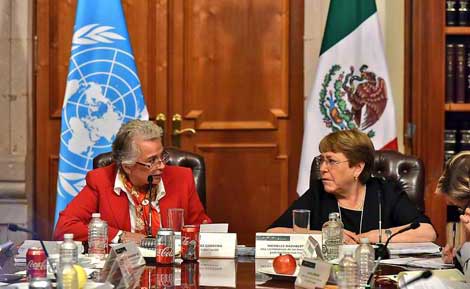 ▲ La secretaria de Gobernación, Olga Sánchez Cordero, y la Alta Comisionada de las Naciones Unidas para los Derechos Humanos, Michelle Bachelet, abordaron durante prolongado encuento privado, además de las desapariciones, los feminicidios, el tema migratorio, el trato a pueblos indígenas y los asesinatos de defensores y periodistas, entre otros temas. Hoy la funcionaria del organismo multilateral será recibida por el presidente Andrés Manuel López Obrador. Foto cortesía de Gobernación