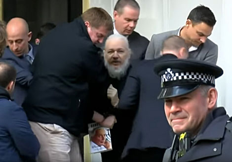 ▲ Arrastrado primero y cargado después por agentes de Scotland Yard, Julian Assange, fundador del portal de Wikileaks, fue entregado por el embajador ecuatoriano en Gran Bretaña, Jaime Marchán. El ciberactivista, quien también tiene la nacionalidad ecuatoriana, gritó: