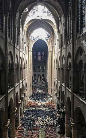 ▲ Las imágenes del interior de la catedral de Notre Dame mostraron la destrucción que causó el incendio de más de 12 horas. Los arcos estaban ennegrecidos por el humo y los restos del techo cubrían el piso de la nave principal, con dos grandes agujeros en las bóvedas. Pese a que autoridades señalaron que la estructura principal resistió, se informó que han identificado
