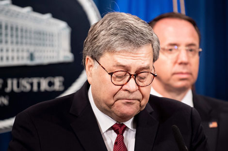 ▲ William Barr, procurador general de Estados Unidos, acompañado por Rod Rosenstein, fiscal general adjunto, aborda en el Departamento de Justicia el informe que se hizo público del fiscal especial Robert Mueller sobre la investigación al equipo de campaña de presidente Donald Trump, en la que se presumía una conspiración criminal con enviados rusos en los comicios de 2016. Foto Ap