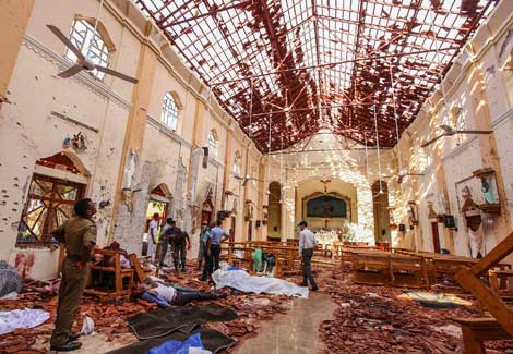 ▲ Ocho artefactos explosivos fueron detonados en tres iglesias que celebraban la misa de Pascua (en la imagen, la de San Sebastián, en la urbe de Negombo) y cuatro hoteles de lujo. Al cierre de esta edición los atentados no habían sido reivindicados, pero se reportan 13 detenidos. De los fallecidos 35 son extranjeros, entre ellos europeos, asiáticos y estadunidenses; se informó de más de 500 heridos. El gobierno decretó el toque de queda y el bloqueo temporal de las redes sociales para evitar la difusión de información falsa. Foto Ap