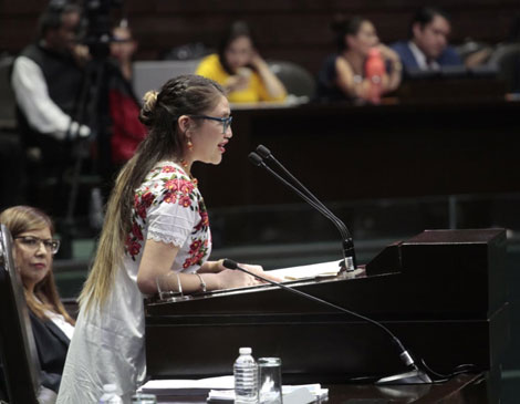 Desde la tribuna de la Cámara de Diputados, Sasil Sánchez Chan, editora de K’iintsil, la sección en escritura maya de La Jornada Maya, pidió que se cumpla con las obligaciones contenidas en la Carta Magna para dar difusión a los idiomas originarios. Acudió como invitada por el Año Internacional de las Lenguas Indígenas. Foto Jesús Villaseca