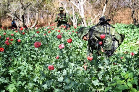 Muchos se van a Chilpancingo por hambre, por eso piden ayuda: ya no quieren vivir como prisioneros, pero tampoco que se les dé atole con el dedo. En la imagen, destrucción de la amapola en una localidad de la región. Foto Sergio Ocampo Arista