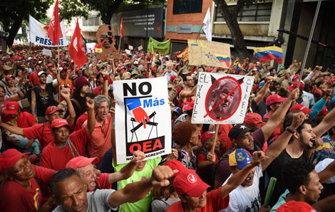 ▲ El canciller de Venezuela, Jorge Arreaza, celebró que su país ya no pertenece a la Organización de Estados Americanos desde ayer, tras cumplir con los dos años establecidos en la carta fundacional de ese órgano para concretar el retiro de la nación petrolera. En la imagen, centenares de seguidores del presidente Nicolás Maduro celebran en una plaza de Caracas la salida oficial del país sudamericano del bloque hemisférico. Foto Afp
