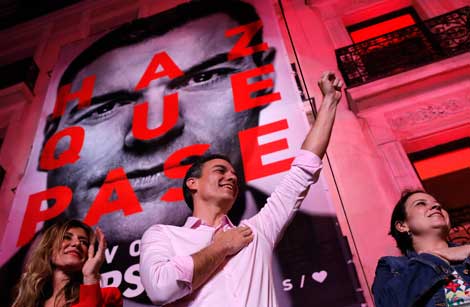 ▲ El Partido Socialista Obrero Español y su líder, Pedro Sánchez, lograron ayer domingo una clara victoria en los comicios españoles, al obtener 123 diputados. La participación de más de 75.75 por ciento del electorado fue clave en estos resultados.