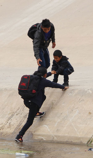 ▲ Unos 700 centroamericanos fueron aprehendidos en Yuma, en la zona limítrofe con Sonora. En los últimos tres días han sido detenidos más de mil 500 indocumentados en esa entidad estadunidense. La imagen muestra el momento del cruce de tres migrantes en la colindancia de Ciudad Juárez y El Paso, Texas; fueron apresados. Foto Afp